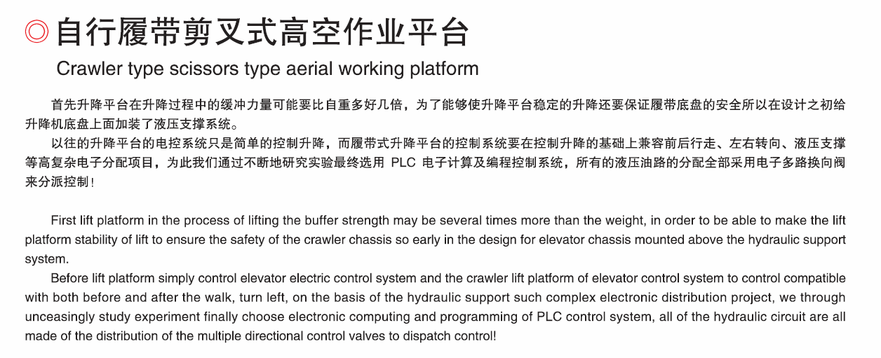 履帶式鋁合金升降機是我們專為野外復(fù)雜路況下高空作業(yè)設(shè)計的一種鋁合金升降機,它適應(yīng)環(huán)境能力特別強,能在野外無電源,路況復(fù)雜的情況下進行高空作業(yè)。它采用履帶式車輪,加重底盤,由柴油發(fā)動機驅(qū)動升降機行走,蓄電池做控制和升降電源,通過控制按鈕控制驅(qū)升降機上升和下降,也可以用柴油發(fā)動機做升降動力通過手動液壓操作桿控制升降機升、降,蓄電池由外接電源充電或通過柴油發(fā)動機帶動發(fā)電機充電。履帶式鋁合金機采用加重底盤,工作時,不需要支腿,在升降機升起后,不需要不把升降機收起即可行走,極大的提高了工作效率,同時,它的履帶式車輪,增加了與大地接觸的面積,在野外泥濘道路上也可行走和工作,是石油勘探、野外通信線路安裝施工等野外高空作業(yè)的理想設(shè)備。