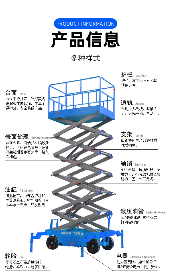產(chǎn)品優(yōu)勢:采用高強度錳鋼結(jié)構(gòu),四輪移動方便、工作臺面寬大,承載能力高,可多人同時作業(yè),使高空作業(yè)更安全、效率更高。